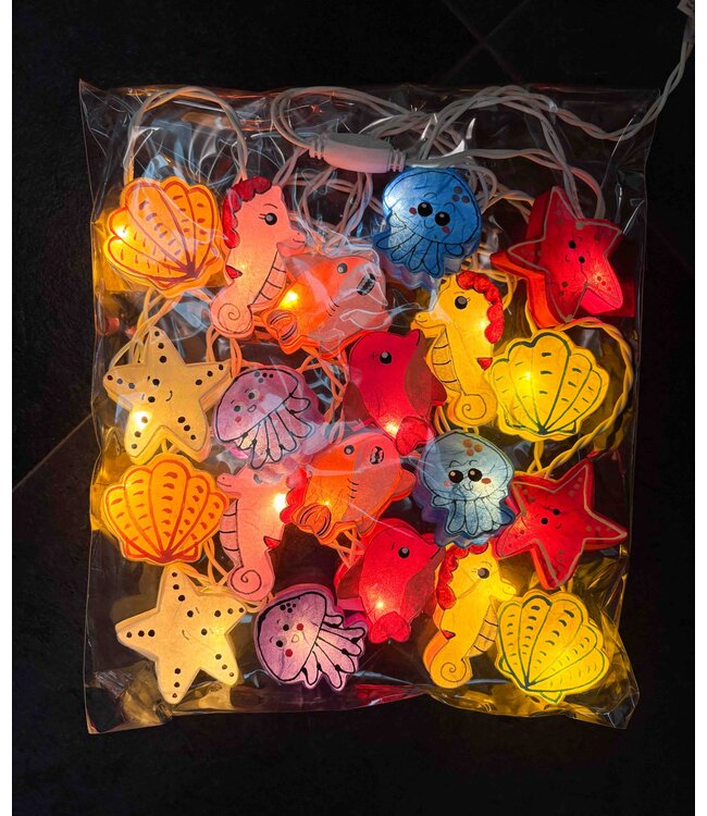- Colour: orange, pink,blue, red and yellow paper animals, white cable
