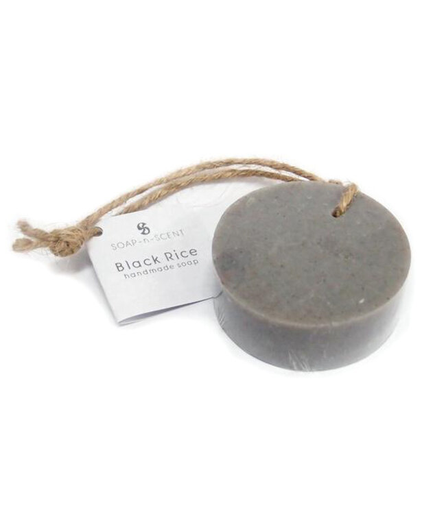 Ronde zeep aan koord. Black Rice. Heerlijk milde zeep en een mooie decoratie.